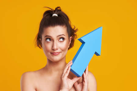 Studio shots of beautiful young woman over yellow background with arrows