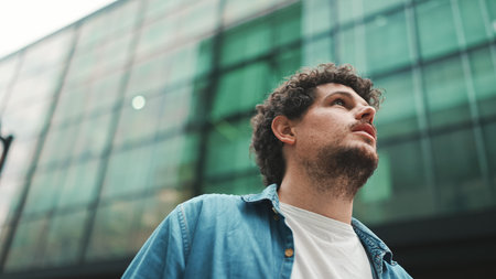 Close-up, man in denim shirt walks down the street, stops and looks around at the upper floors of modern buildings