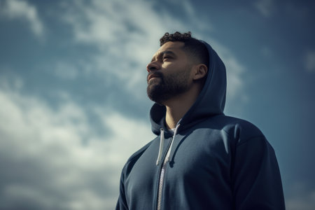 Caucasian male with beard looks up thoughtfully under blue sky