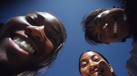 AI-generated image.Three Black girls smile enthusiastically as they pose for a selfie from a low angle, with a blue sky as their background. The vertical composition and upward perspective convey closeness, positive energy, and spontaneity. Ideal for campaigns about diversity, friendship, youth, summer, inclusion, or a joyful lifestyle.