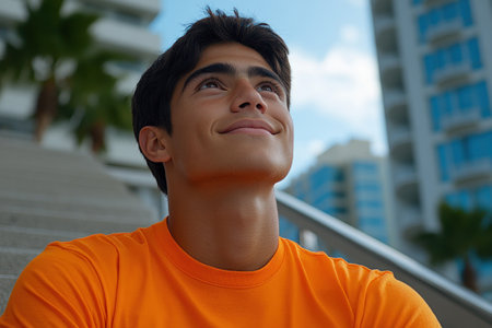 Male teenager in an orange shirt gazes up with a joyful expression, surrounded by buildings.