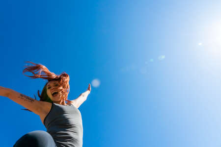 Beautiful woman jumps high up. She flies swiftly against the sky, joyful and happy.