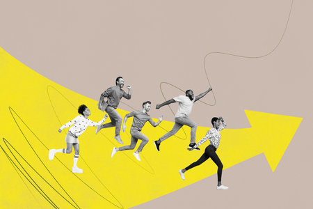 Creative collage picture illustration black white filter five successful excited happy colleagues jump arrow way sketch exclusive template