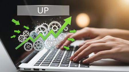Up arrow and gears on laptop screen. Business and finance concept.