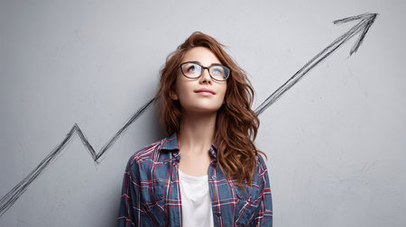 Portrait of a beautiful young woman in glasses and a checkered shirt standing near a gray wall with a growing graph