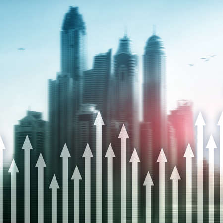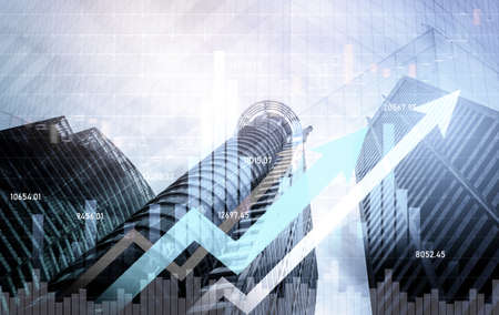 Up arrow graph on skyscraper background. Invesment and financial growth concept.