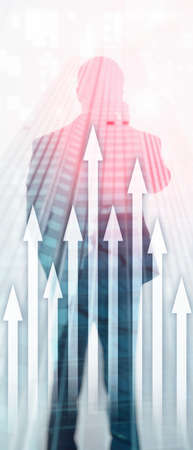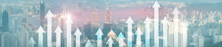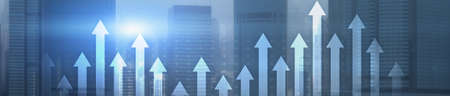 Vertical Panorama Banner. Up arrow graph on skyscraper background. Invesment and financial growth concept.