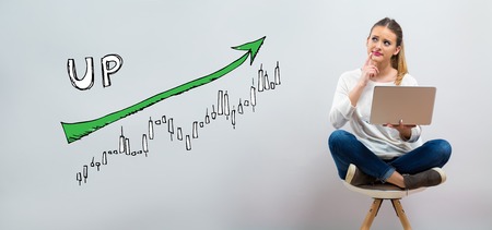 Market up trend chart with young woman using her laptop on a grey background