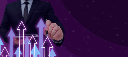 Businessman Holding Tablet And Pen Which Points On Arrows Up And Presenting Crutial Ideas. Man In Suit Having Cellphone And Pencil In Hand To Show Important Informations.