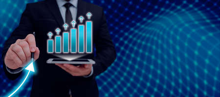 Businessman Holding Tablet With Graph And Pen Which Points On Arrow Up And Presenting Crutial Ideas. Man In Suit Having Cellphone And Pencil In Hand To Show Important News.