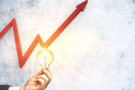 Hand holding lightbulb and growing red arrow on concrete wall. Leadership and challenge concept. Close up