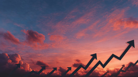A striking sunset sky filled with vibrant clouds showcases upward arrows, symbolizing growth and success. Perfect for business and motivational themes in various projects.
