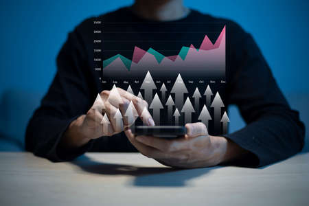 Businessman hand holding smartphone with increasing virtual investment graph and chart for stock market analysis trend and technical by trader concept.