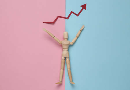 Wooden puppet mannequin holding a growth arrow on pink blue pastel background. economic growth, business concept