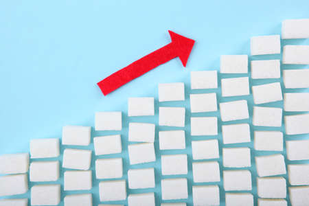 Concept: Ascending stacks of sugar cubes over blue background and with copy space for text or other desing. This in a concept for high risk of diabetes or other diseases caused by excessive consumption of sugar