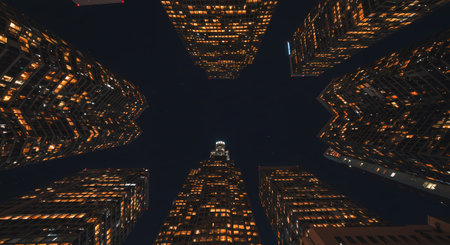 An upward perspective captures tall buildings against a dark, overcast sky. The image displays a symmetrical composition, with the buildings' windows emitting warm light contrasting with the cold, gray surroundings. The overall mood evokes a sense of depth and scale, suitable for various editorial and commercial applications.