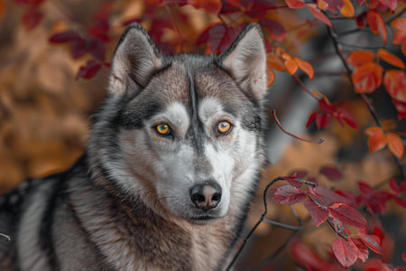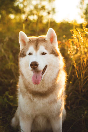 Close-up Portrait of beautiful beige and white siberian husky dog with brown eyes sitting in the dogrose bushes at sunset in bright fall with golden backlight.