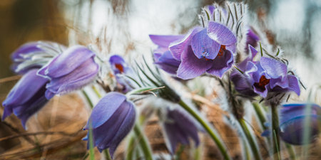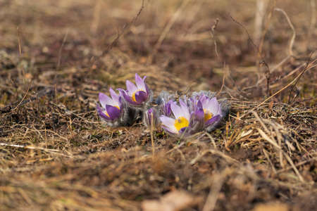 Pasque flowers on spring field. Photo Pulsatilla grandis with nice bokeh.