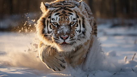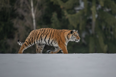 Siberian Tiger running in snow. Beautiful, dynamic and powerful photo of this majestic animal. Set in environment typical for this amazing animal. Birches and meadows