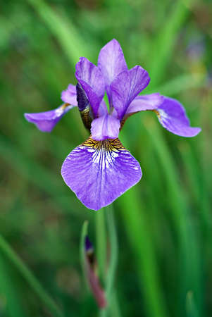 A single beautiful purple iris bloom in a garden.