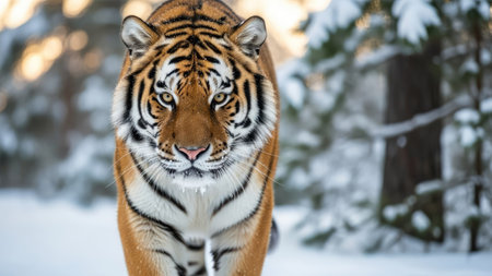 A striking tiger is captured in a wintry environment. The image displays the animal's orange and black striped fur against a backdrop of snow-covered trees. The composition utilizes natural lighting, emphasizing the tiger's focused gaze. Suitable for editorial purposes and could be used for conservation themes.