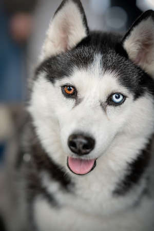 Husky dog portrait, winter snowy background. Funny pet on walking before sled dog training.