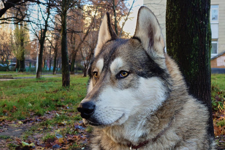 Adorable young Alaskan Malamute. Young dog indoor portrait. Friendly smile, brown eyes, white snout. Selective focus on the details, blurred background.