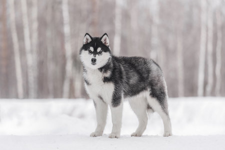 Strong and confident Siberian Husky with thick black and white fur stands on snow against blurred birch forest background, showcasing elegant posture and northern endurance