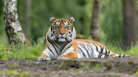 Majestic tiger staring intently in lush green forest showcasing wildlife photography and nature's beauty with a captivating gaze.
