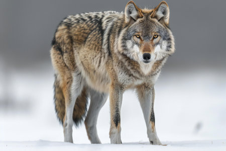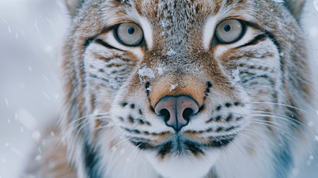 Majestic lynx stands amidst snowflakes, highlighting its beautiful fur and intense gaze, embodying the essence of wildlife in a tranquil winter setting
