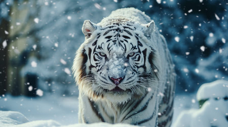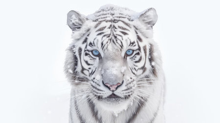 A captivating close-up of a tiger displaying striking blue eyes and beautifully detailed fur. This powerful creature epitomizes wild elegance amidst a snowy backdrop.