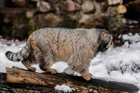 Proudly paces against the background of a log. Severe brutal fluffy wild cat manul on white snow.