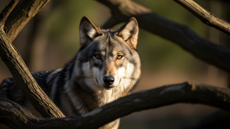 A beautiful wild grey wolf is framed artistically by thick tree branches in a forest setting, looking directly at the camera. The soft lighting illuminates the wolf's face, emphasizing its connection to the woodland environment.