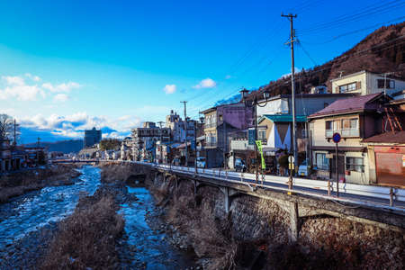 Yudanaka, Japan - January 08, 2020: Winter View to the Fast and Cold River in the Yudanaka city