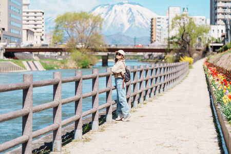 Woman tourist sightseeing Iwate mountain and Kitakami river with flowers in Spring, happy traveler travel in Morioka city, Iwate prefecture, Japan. famous Landmark Travel and Vacation destination
