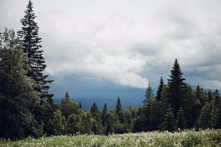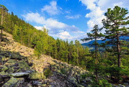 Carpathian Mountain summer landscape with sky and cumulus clouds, pathway, fir forest and slide-rocks (Ihrovets, Ukraine).