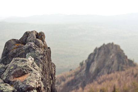 Mountain landscape Aigir rocks dawn of the day morning fog rises from below, rock cliff, Russia Bashkortostan, Southern Urals. high quality photo