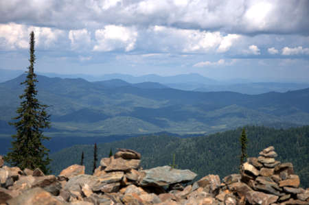 Sacred stone pyramids on top of a hill with a picturesque view of the mountain peaks and tall pine trees. Altai, Siberia, Russia.