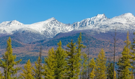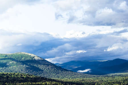 Mountain view from the valley with a pine forest. National Park, nature reserve Kuznetsky Alatau.
