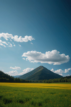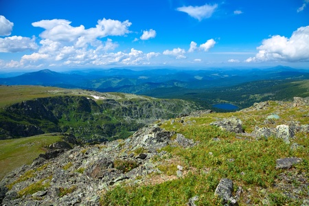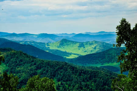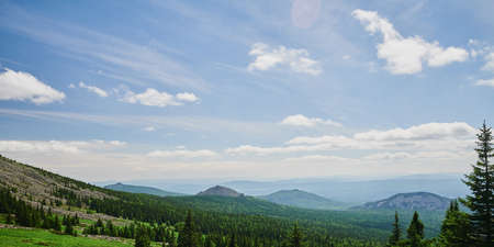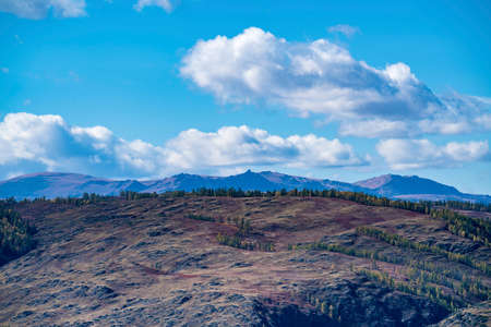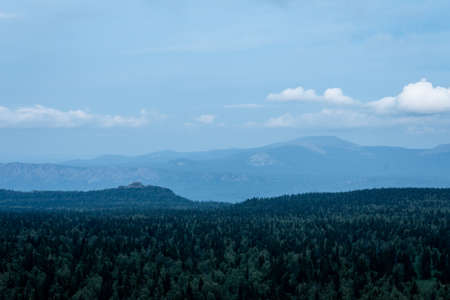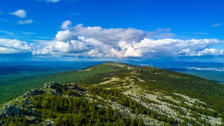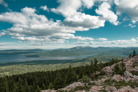 Beautiful landscape with a mountain range on a blue sky with white clouds on the forest meadows and lake in summer Russia, Chelyabinsk region, Zyuratkul Range