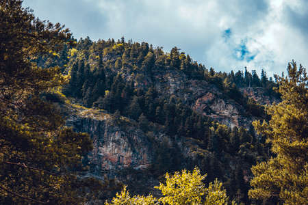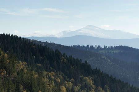 Autumn mountain landscape .Hill slope with coniferous thickets against the background of mountain ranges and blue sky.