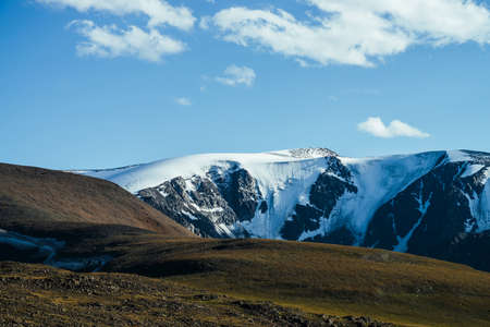 Awesome alpine view to big snowy mountains with glacier. Wonderful highland scenery with great snowy mountains and clouds in blue sky. Amazing mountain landscape with glaciers and melt water streams.