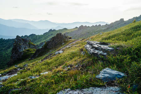 Awesome mountain landscape with sharp stones and pointed rocks among rich vegetation on hillside. Beautiful highland scenery with alpine flora on rocky hill in sunlight. Footpath among pointy crags.