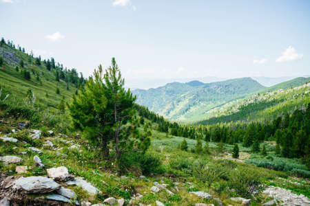 Beautiful small young cedar on hillside on background of great mountains. Awesome alpine landscape with coniferous tree on mountainside. Wonderful scenery with mountains and forest. Scenic nature.