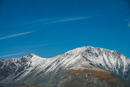 Alpine landscape with high snowy mountain with peaked top under cirrus clouds in sky. Atmospheric view to big snow covered mountains in sunshine. Black rocks and white-snow pointy peak in sunlight.