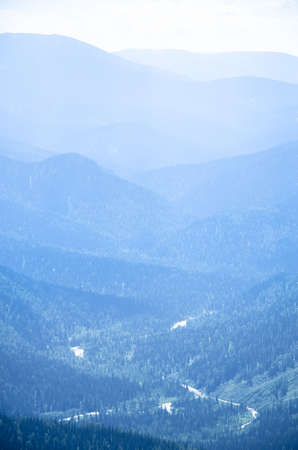 Beautiful autumn landscape from high point in Altai mountains with fir trees in foreground and hills overgrown with forest in misty background, Russia, Manzherok district