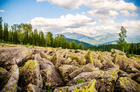 birch and pine forest. blue sky with clouds. mountains and large rocks