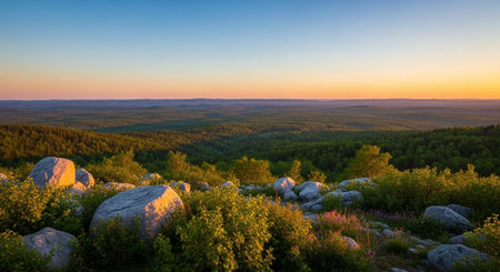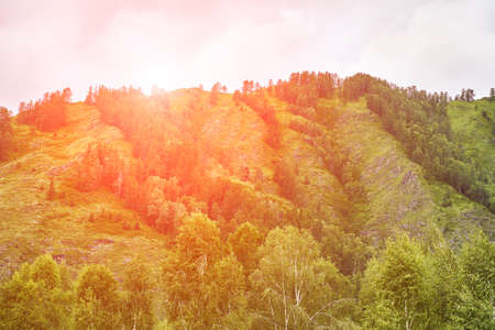Evening mountain landscape. Mountains rocks trees against the setting sun. Krasnoyarsk National Park Pillars.