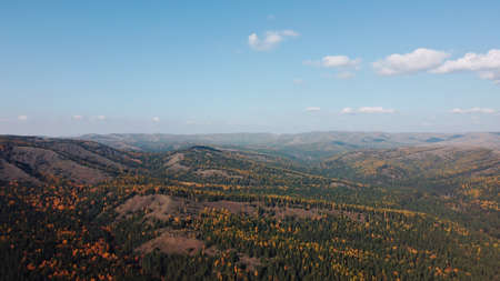 Beautiful autumn nature. Trees in the forest in the mountains, blue sky and white clouds. Photos from the drone