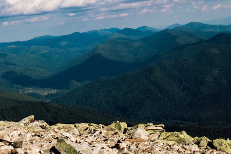 Landscape of Carpathians mountains at summer, west Ukraine. Blue sky with big white cumulus. Valley between green hillsides covered with dense forest of firs. Pile of grey stones. Blurred background